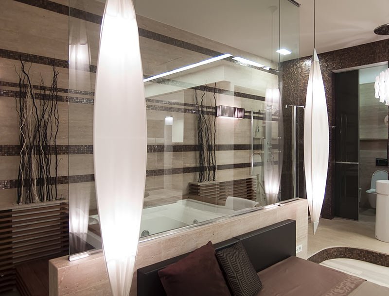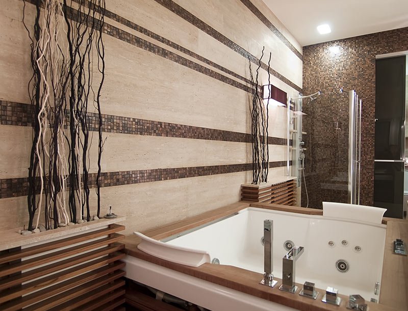 Tile and plastic paint combination on walls provides a seamless and modern aesthetic.